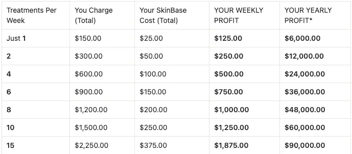 This table shows your potential profit based on you charging $150 to your client, and your SkinBase cost being $25 per treatment.